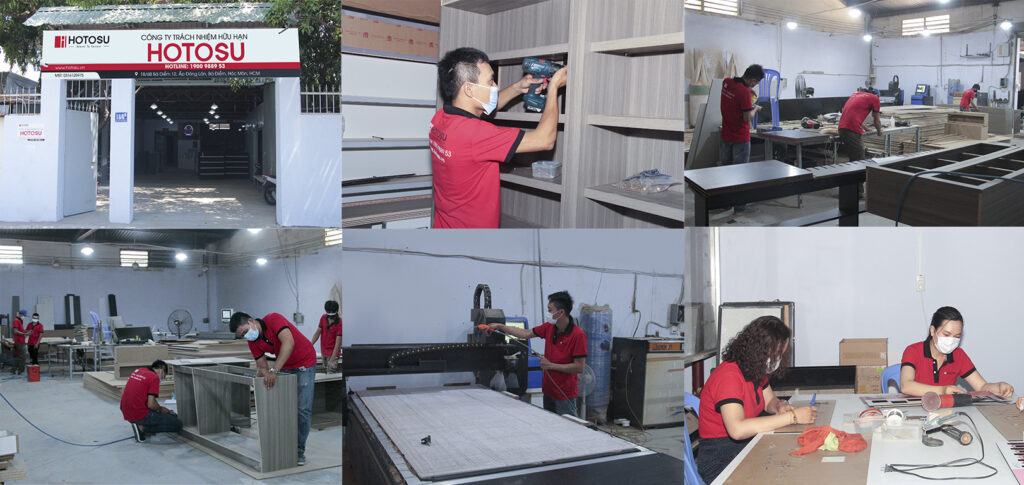 HOTOSU sở hữu nhà máy công nghiệp tại TP.HCM với quy mô hơn 2000m2, tọa lạc tại huyện Bà Điểm. Xưởng được trang bị nhiều máy móc, thiết bị chế biến gỗ hiện đại như máy CNC đa chức năng, máy cưa, máy cắt, máy khoan lỗ cam, máy dán cạnh tự động, máy chà nhám và nhiều thiết bị cầm tay hiện đại khác.